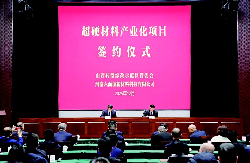 本报讯 (记者张翔宇王翔飞文/摄)12月24日,山西转型综改示范区与河南六面顶新材料科技有限公司举行“超硬材料产业化项目”签约仪式。省政府副秘书长、山西转型综改示范区党工委书记、管委会主任胡勇,河南六面顶新材料科技有限公司董事长马南阳出席。河南六面顶新材料科技有限公司总经理王立旗,山西转型综改示范区党工委副书记、管委会副主任张效生致辞。交通银行山西省分行、中国人民财产保险股份有限公司山西分公司、中国人民人寿保险股份有限公司山西分公司负责人参加。仪式由山西转型综改示范区党工委委员、管委会副主任、管委会总会计师乔建伟主持。