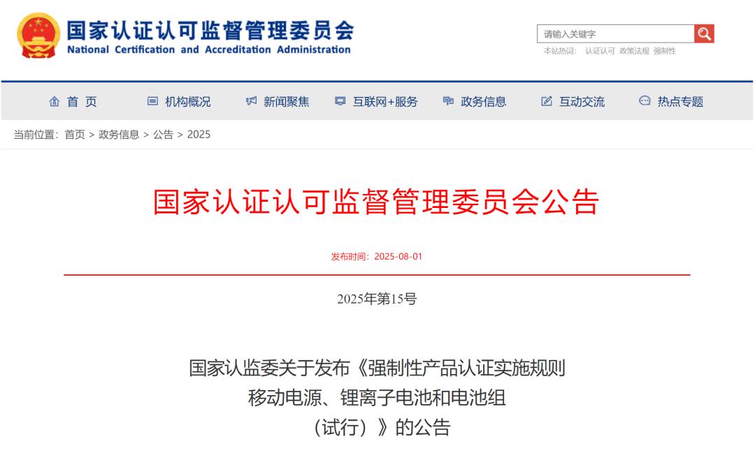 8月15日,由国家认监委制定的《强制性产品认证实施规则 移动电源、锂离子电池和电池组(试行)》正式施行,对充电宝、锂离子电池和电池组实施新的强制性产品认证实施规则,也就是我们常说的CCC认证实施规则。