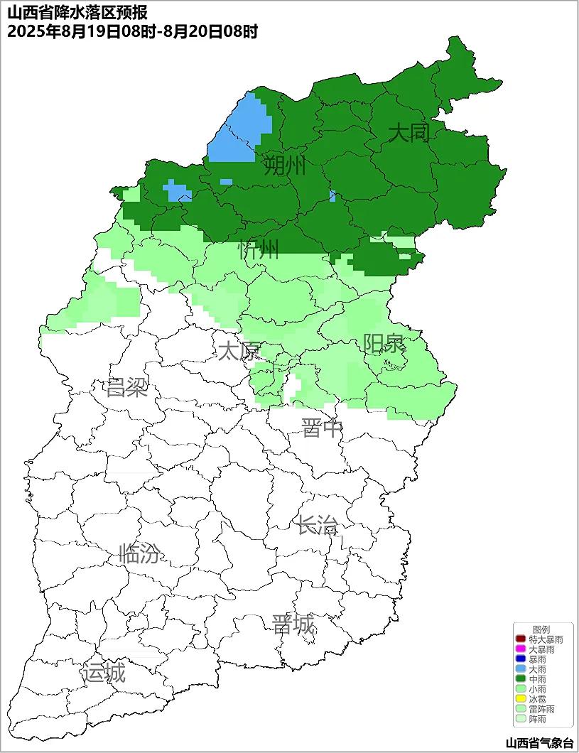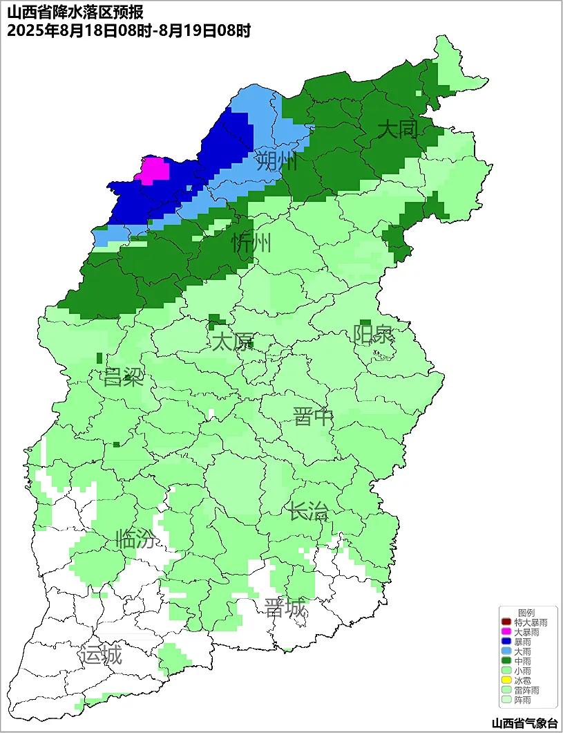 全省多云转阴天,北中部大部和南部局部地区有阵雨或雷阵雨,大同、朔州、忻州、吕梁北部等地的部分地区有中到大雨,局部地区有暴雨,并伴有雷暴大风、短时强降水等强对流天气;临运盆地部分地区有35℃以上的高温天气。