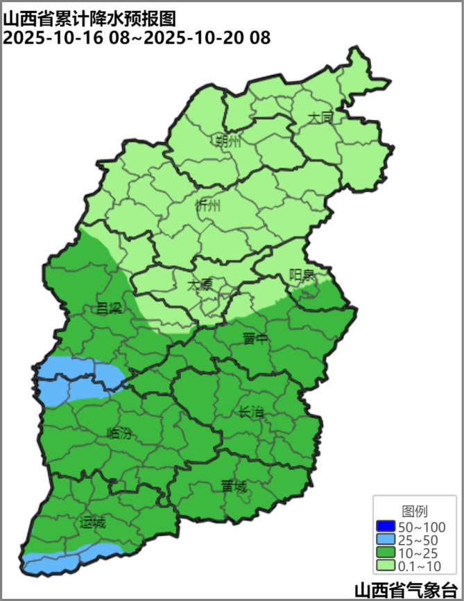 10月16日白天~夜间,全省多云转阴天,有阵雨或小雨,中部局部和南部大部分地区有中雨,吕梁、临汾、运城等地的局部地区有大雨。降水间歇北部局部和中南部部分地区有雾或轻雾。