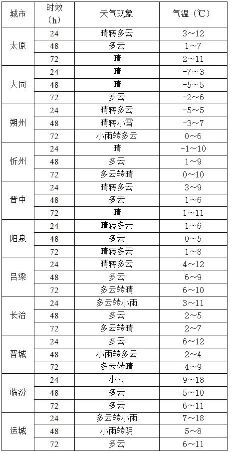 山西北中部多云转阴天,南部阴天间多云;忻州、吕梁、运城、临汾、晋城等地的部分和朔州、太原等地的局部地区有阵雨或小雨,北部山区有雨夹雪或小雪。