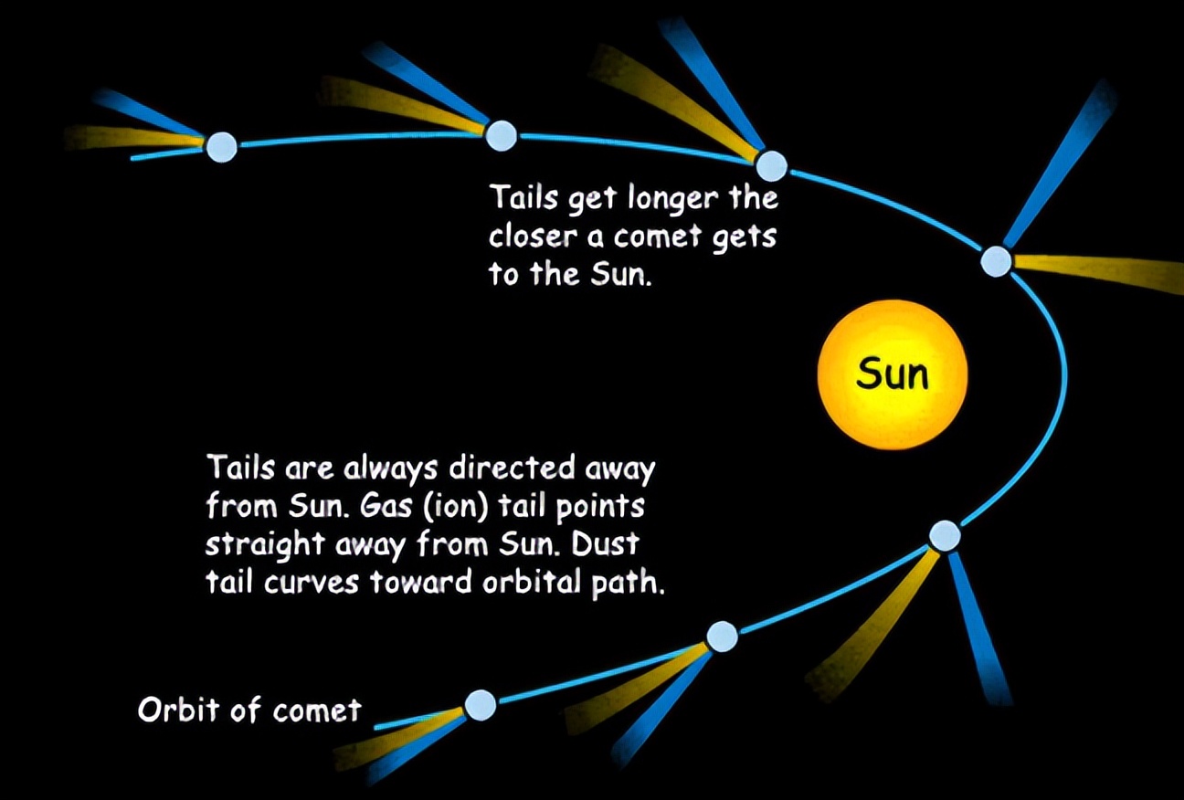 也就是说,彗尾并不指向和运动方向相反的方向,而是指向和太阳相反的方向。