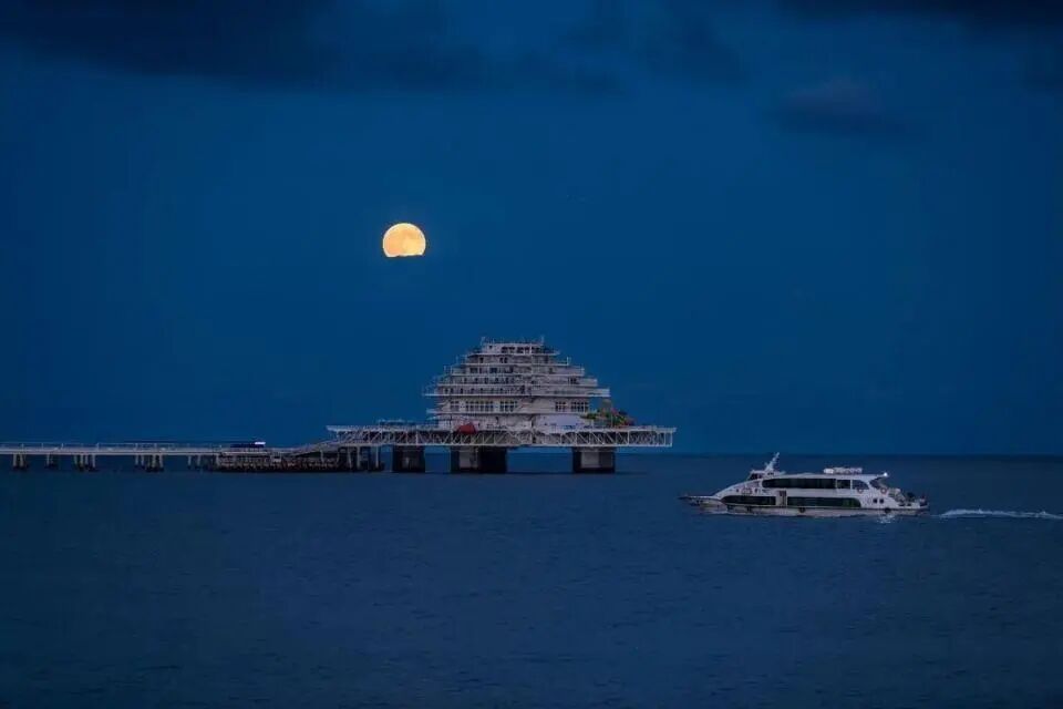 2025年10月7日,山东烟台渔人码头的“超级月亮”。