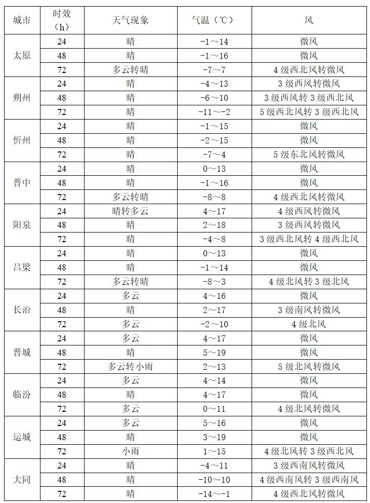 根据太原市气象台预报,受较强冷空气影响,预计11月16日至18日,太原市将出现大风、降温天气过程,全市有4~6级、短时7级或以上西北风,气温明显下降,过程降温幅度7~9℃,部分地区可达寒潮标准。最低气温将出现在18日早晨,介于-11~-7℃。
