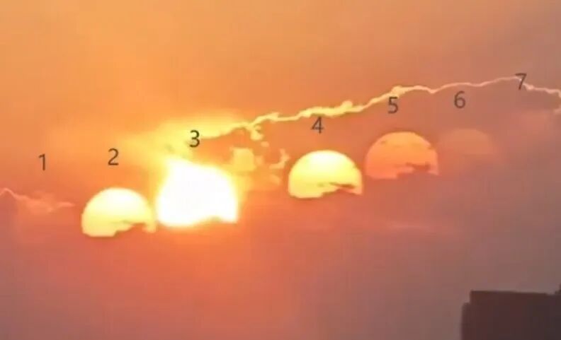 2024年8月,四川成都市民王女士拍到空中同时出现7个太阳一字排列的奇异景象。从视频看,多个太阳的成像都是正立的,且有明显的减光,符合折反射成虚像的特征。