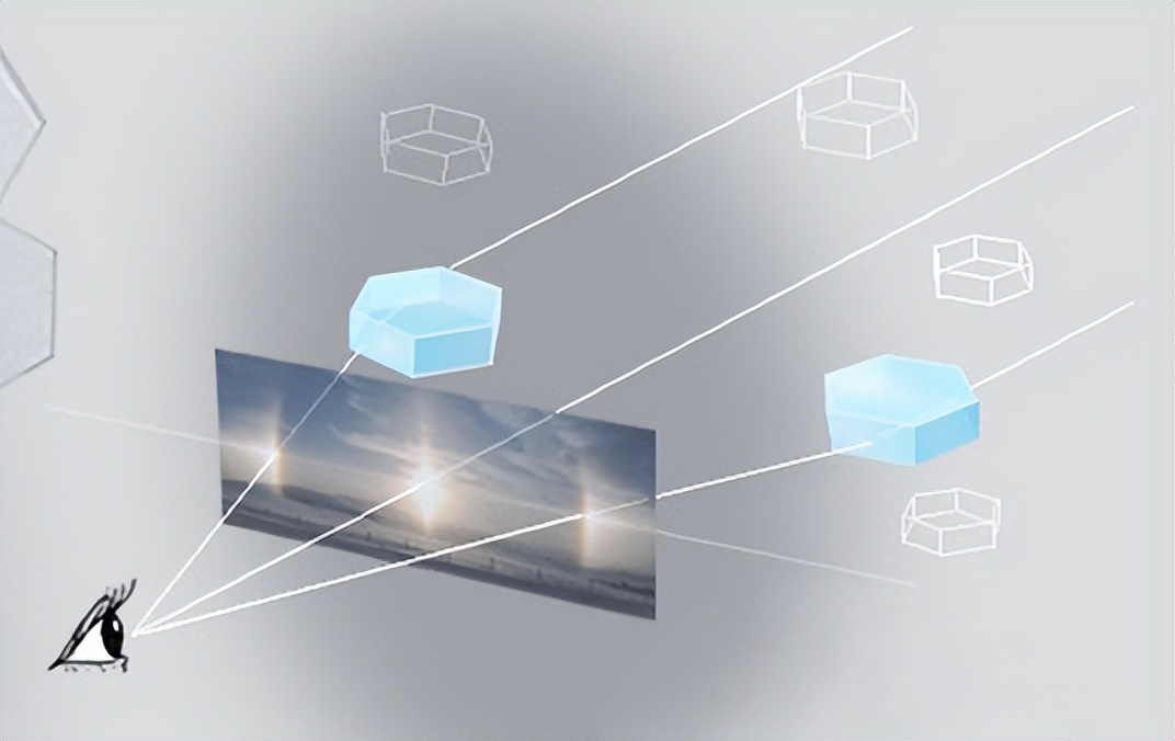 这些冰晶在空中缓缓地向下漂移,在漂移过程中,六边形的底面水平朝下,阳光以接近水平的角度从冰晶的侧面射入,穿过冰晶并发生折射,偏转大约22°后再进入观察者的眼睛,于是我们就看到了在同一水平高度上出现了一左一右两个太阳的虚像。