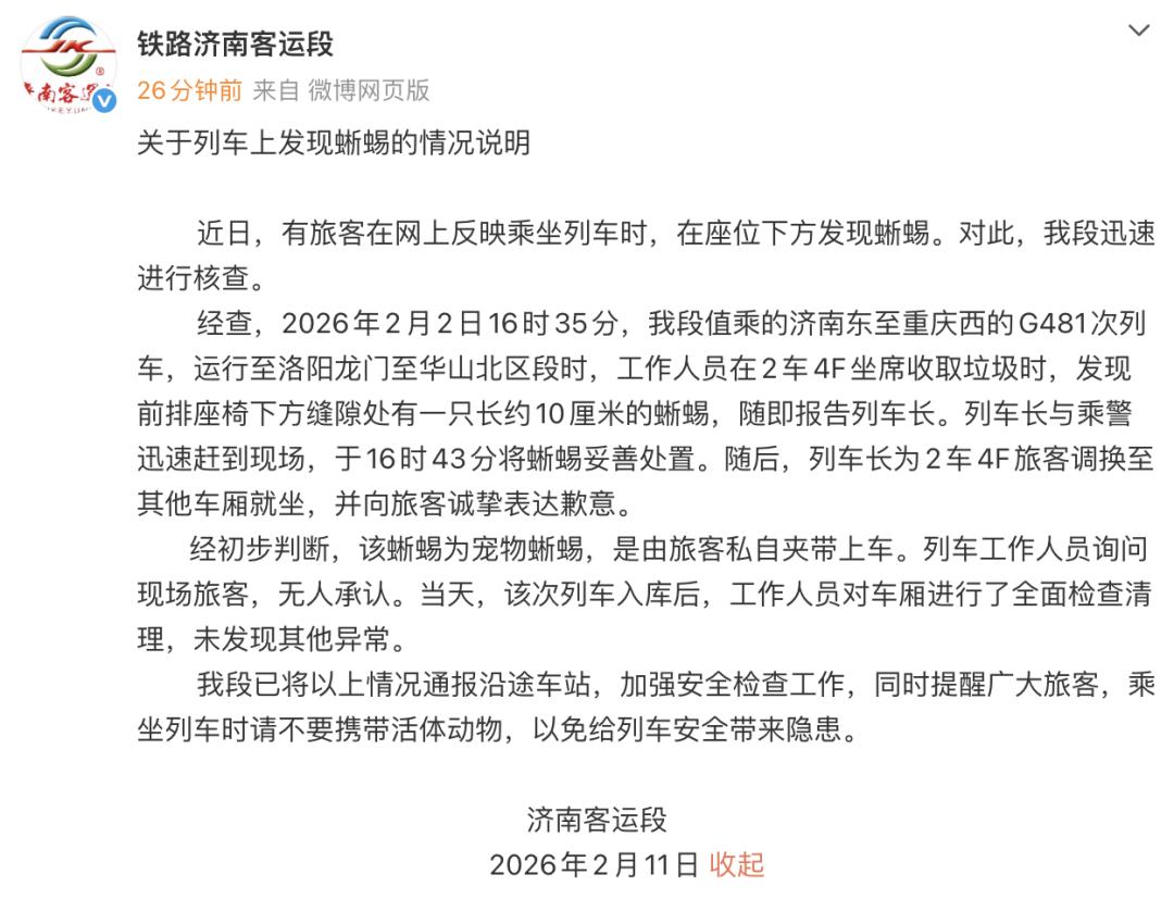 2月11日,铁路济南客运段发布关于列车上发现蜥蜴的情况说明: