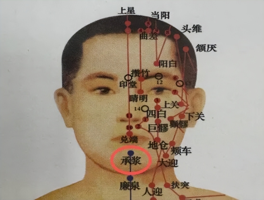 任脉穴。位于头面部,在颏唇沟的中央。以拇指向里按压,并不停地上下摆动,用于缓解牙痛。