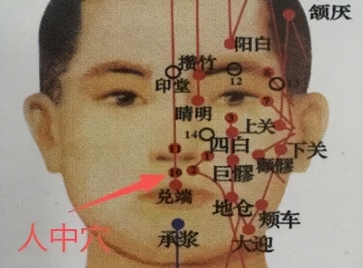 也叫水沟,督脉穴。位于头面部,在鼻下人中沟的上1/3与下2/3交点处。以拇指朝鼻的方向用力切按,功用同合谷穴。