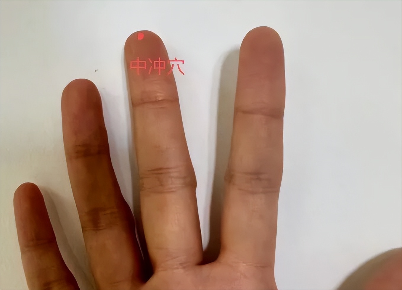 心包经穴。位于手指,在中指尖端的中央,以拇指切按,主要缓解晕厥。