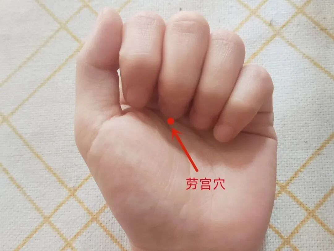 心包经穴。位于掌心,在第2、3掌骨之间,握拳时中指尖下即是。以拇指切按,用于缓解心绞痛、癫狂、抽搐及血压骤升。