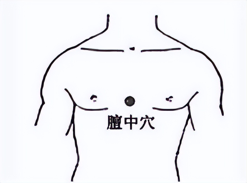 任脉穴。位于胸部,在前正中线上,两乳头之间。以拇指揉按,用于缓解心绞痛、哮喘。