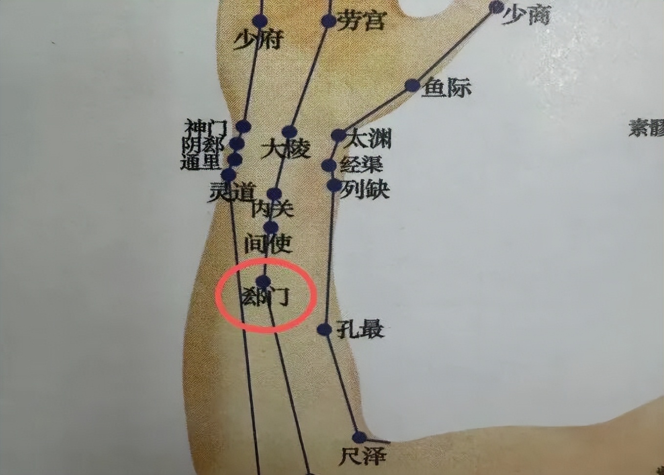 心包经穴。位于前臂,在腕横纹上5寸,桡侧腕屈肌腱与掌长肌腱之间,仰掌取穴。以拇指揉按,用于缓解心绞痛。