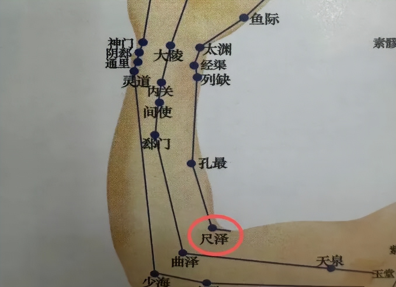 肺经穴。位于肘部,仰掌微屈肘,在肘横纹中,肱二头肌腱桡侧凹陷中。以拇指重力揉按,功用同合谷穴。