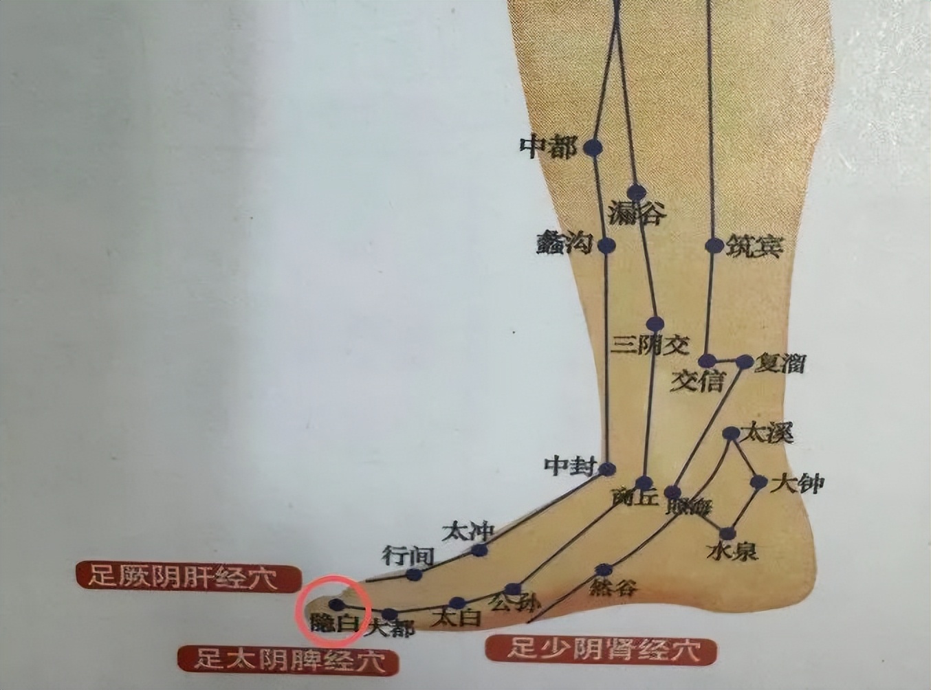 脾经穴。位于足趾,在拇趾内侧端,距趾甲角1分许。以拇指切按,用于缓解出血症。