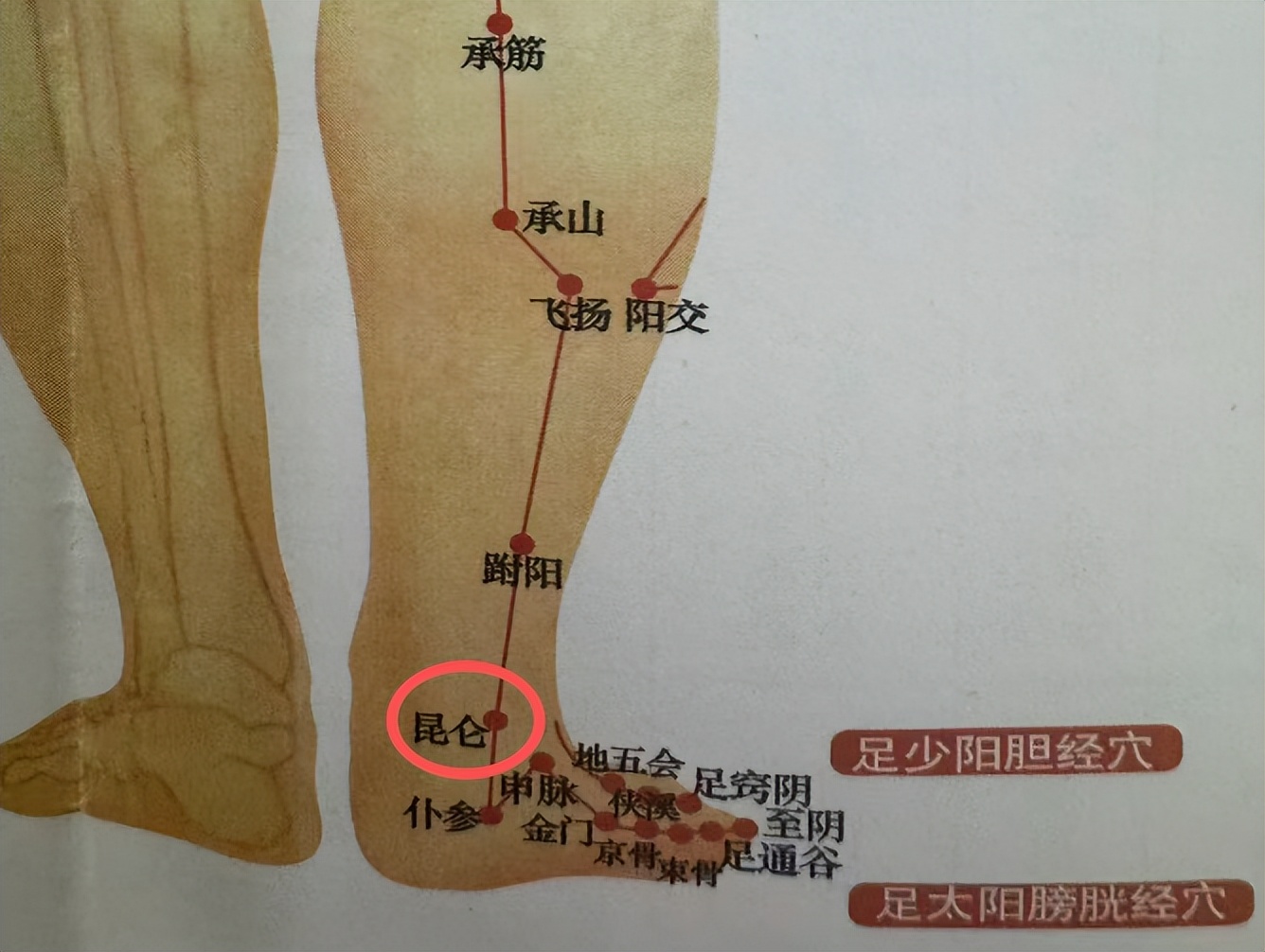 膀胱经穴。位于足部,在踝后外侧,外踝尖与跟腱之间的凹陷中。以拇指揉按,用于缓解头晕及胸闷、气短。
