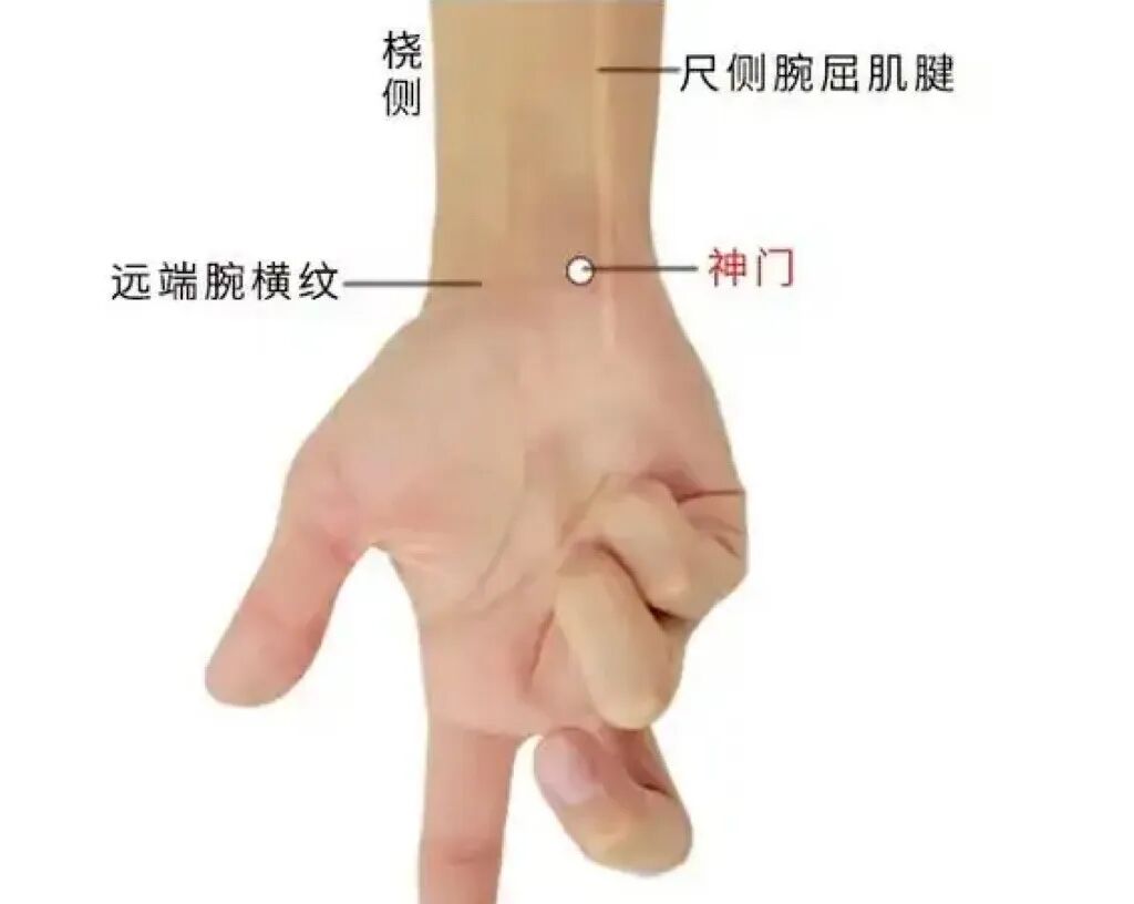 神门穴位于手腕部位,腕掌侧横纹尺侧端,尺侧腕屈肌腱的桡侧凹陷处。简单来说,就是在手腕横纹上,小指侧末端能摸到的一个凹陷处。