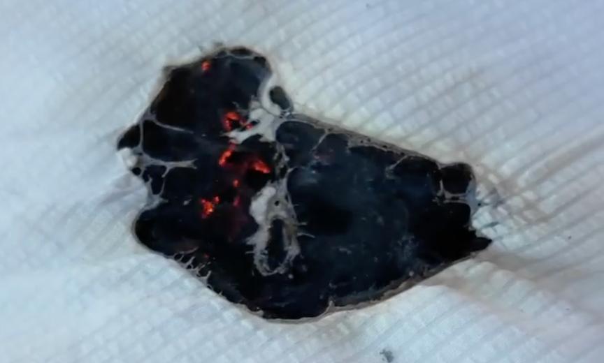 现场能明显看到,烟头掉落瞬间就将棉被烧出了一个孔。由于空气流通较好,此时棉被虽处于阴燃状态,但不断有火星迸出。