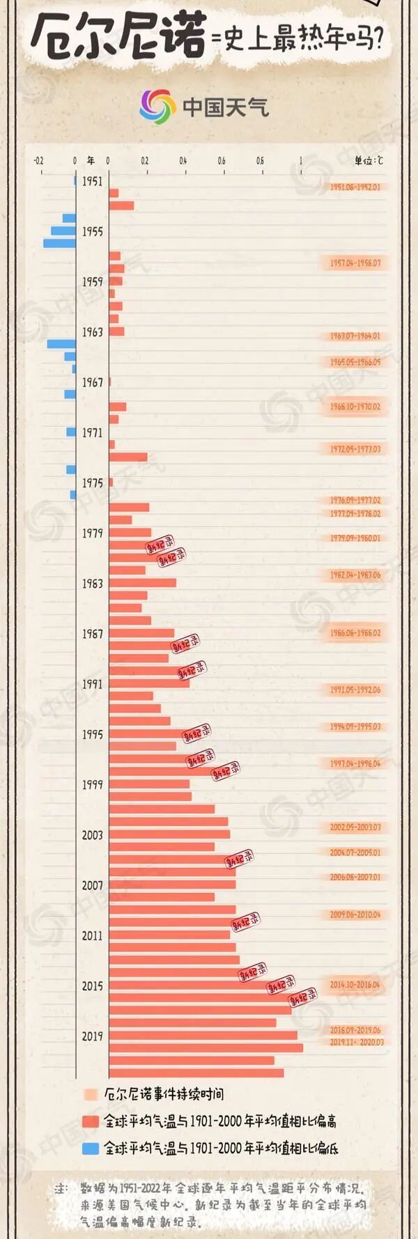中国天气网统计气象大数据发现,厄尔尼诺擅长制造“暖冬”“史上最热”、暴雨洪涝等一系列极端天气气候事件,甚至引发全球性的气候异常,而且往往会加剧全球平均气温的升高,多次创下最暖纪录。