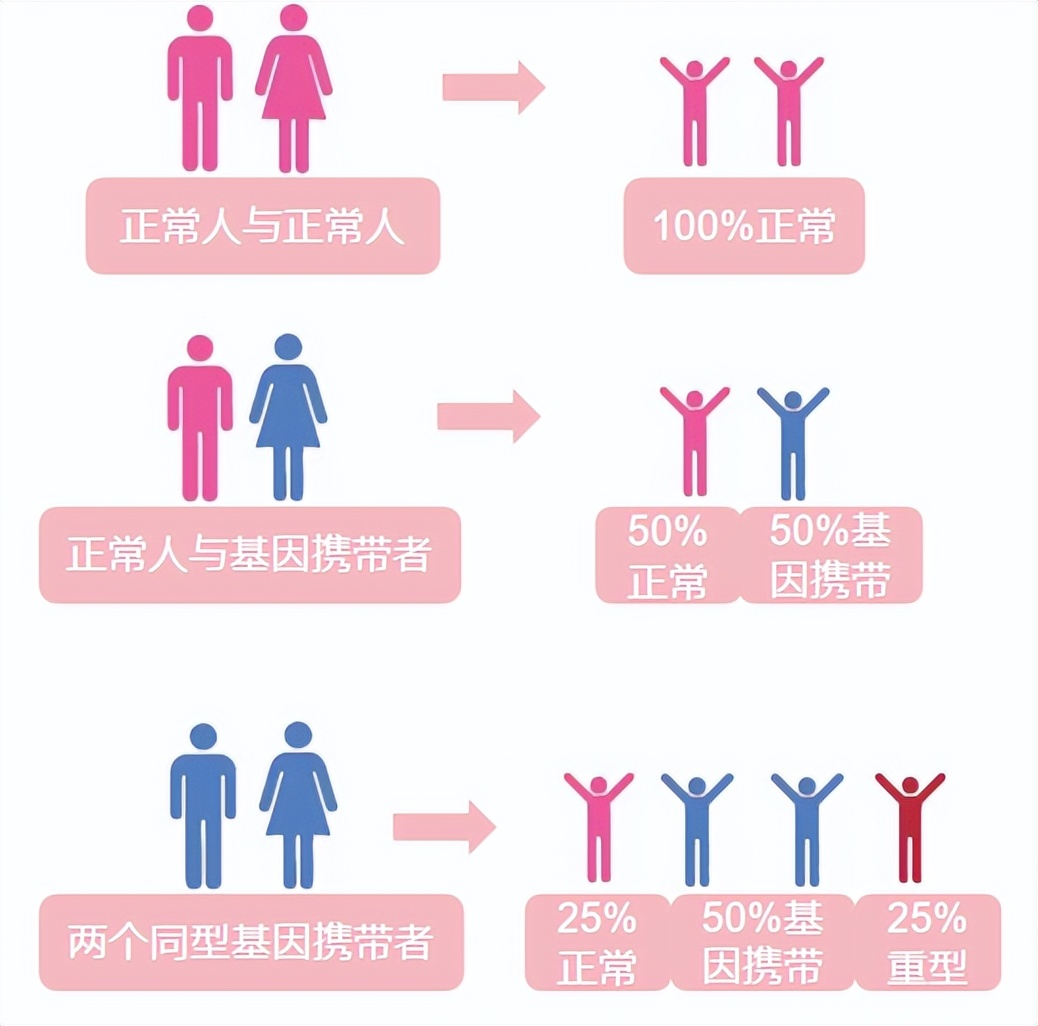 若夫妻双方都是同一类型的地中海贫血基因携带者,他们的子女有25%的机会正常,50%的机会成为地中海贫血基因携带者,25%的机会成为重型地中海贫血患者。