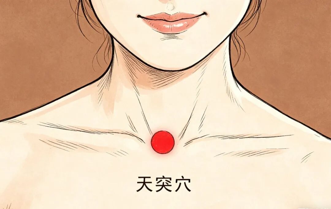 按揉天突穴可宽胸理气、疏通气道,尤其适合喉咙有异物感、郁痰咳不出来,还能缓解咽喉肿痛、声音嘶哑。