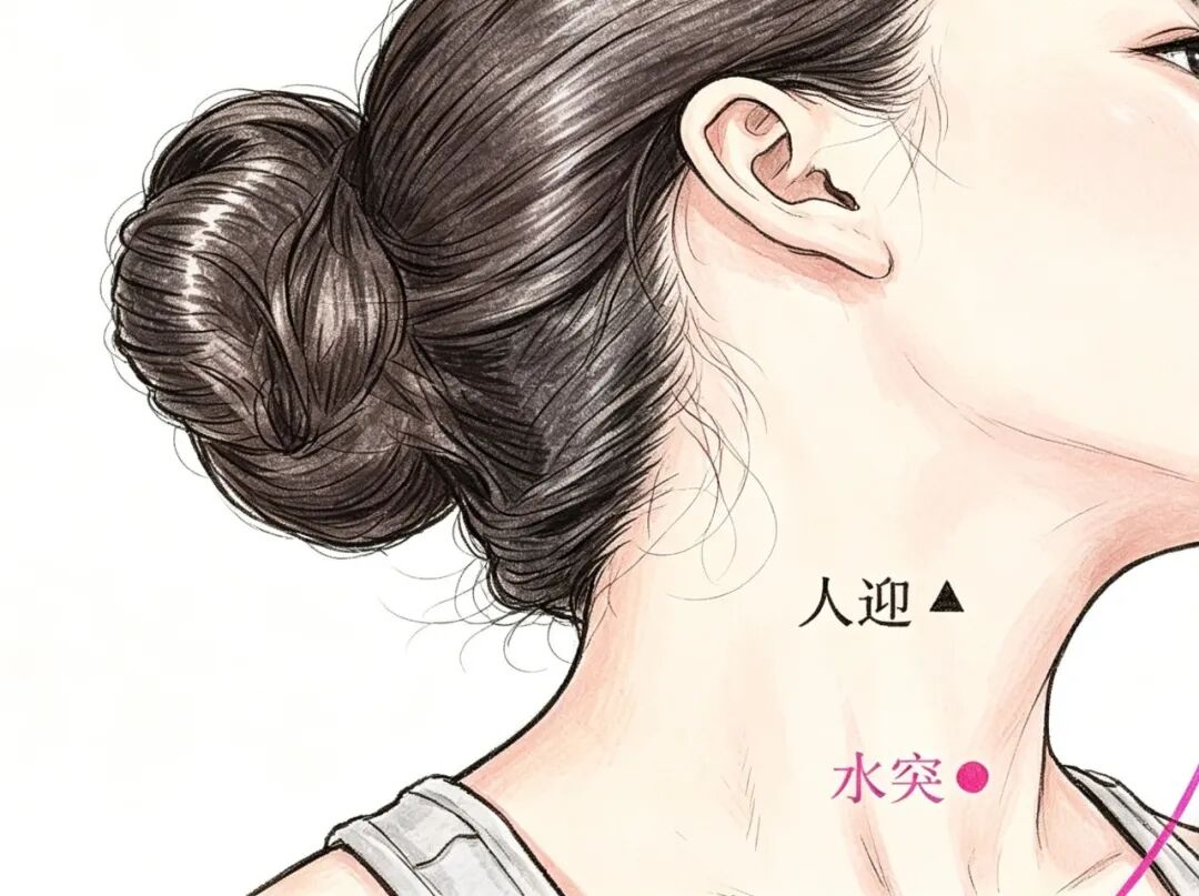水突穴位于喉结旁边,摸到脖子上的大筋(胸锁乳突肌)前缘,颈总动脉搏动的地方往下一横指就是水突穴。