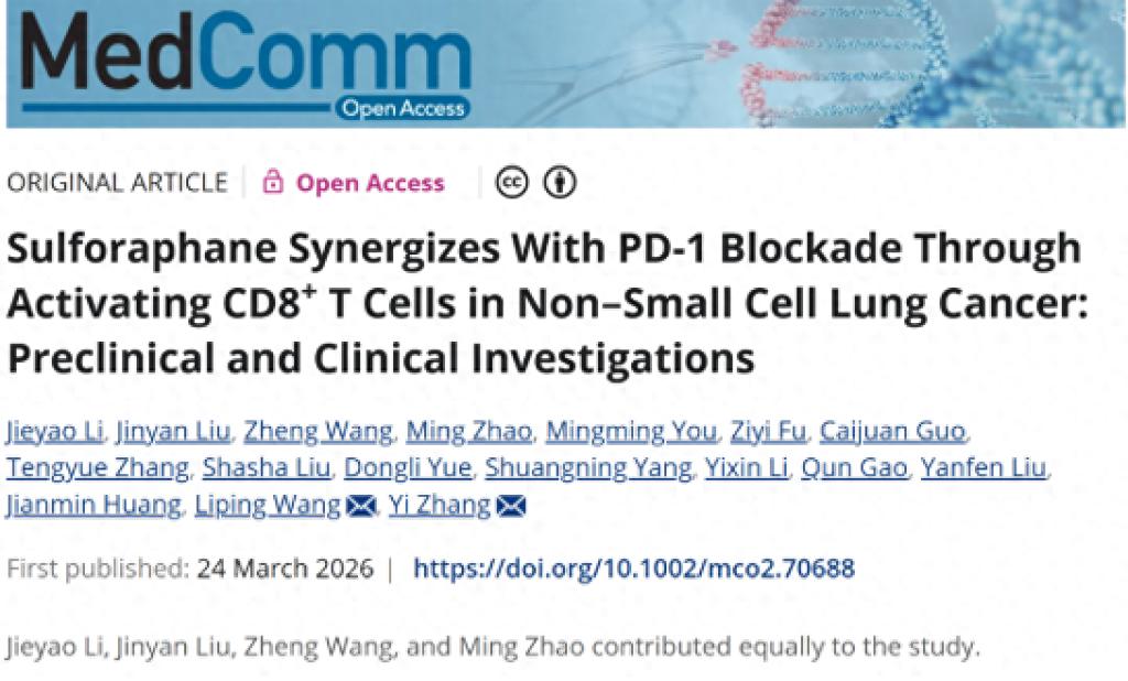 2026年3月,郑州大学第一附属医院生物细胞治疗中心科研团队发表在国际期刊《医疗通讯》的最新研究发现,一种食品级天然植物提取物莱菔硫烷,能够增强PD-1单抗治疗晚期非小细胞肺癌疗效,为晚期非小细胞肺癌临床治疗提供了全新策略与方向。
