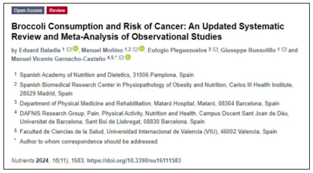 2024年,西班牙营养与饮食学会的研究人员在营养学领域著名期刊《营养素》上发表了一篇研究,该研究分析了超70万人发现,多吃西兰花有助于降低总体癌症风险。