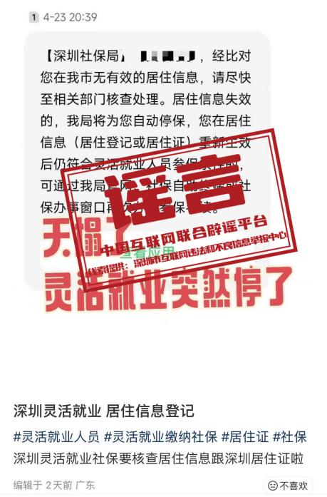此前,深圳社保仅向部分灵活就业参保人发送提醒短信,告知“经比对,您在我市无有效居住信息,请尽快至相关部门核查处理。居住信息失效的,我局将为您自动停保”。该提醒内容被部分自媒体恶意标题化炒作,误导参保人员产生疑虑。