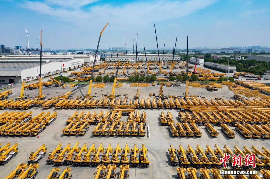 资料图:徐工集团生产车间外停放的起重机。(无人机照片)泱波 摄