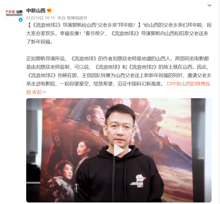 《流浪地球2》郭帆通过媒体向山西父老乡亲拜年。