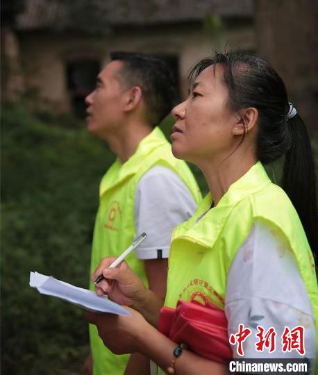 图为霍娟(前)与同伴在山间巡查古建筑。(资料图)(受访者供图)