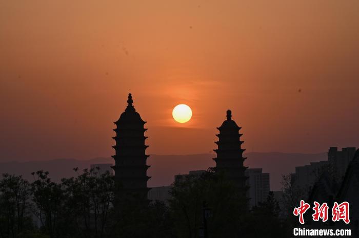 2024年4月17日,山西省太原市,夕阳与百年古刹永祚寺双塔相互映衬,现“双塔落日”景观。 韦亮 摄