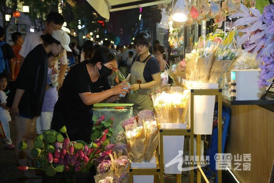 游客驻足花摊前用手机记录绽放的鲜花,夜间消费也要“仪式感”。