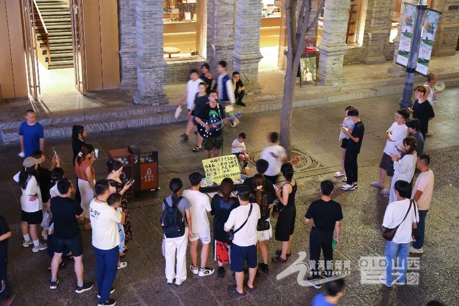 弹唱歌手吸引路人围成“天然观众席”,城市公共空间因文化互动更显温情。