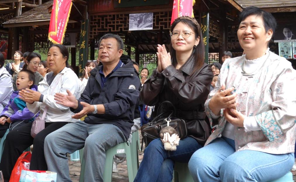 景区内的民俗文化广场上,旱船演员身着“国庆快乐”服饰推彩船,呼啦火圈表演者转“火环”,小丑捏主题气球、撒红色故事卡片。景区负责人表示,国庆期间民俗活动不断,景区同步设置红色讲解专场和非遗小吃区,打造“观表演、学历史、品美食”一站式体验。