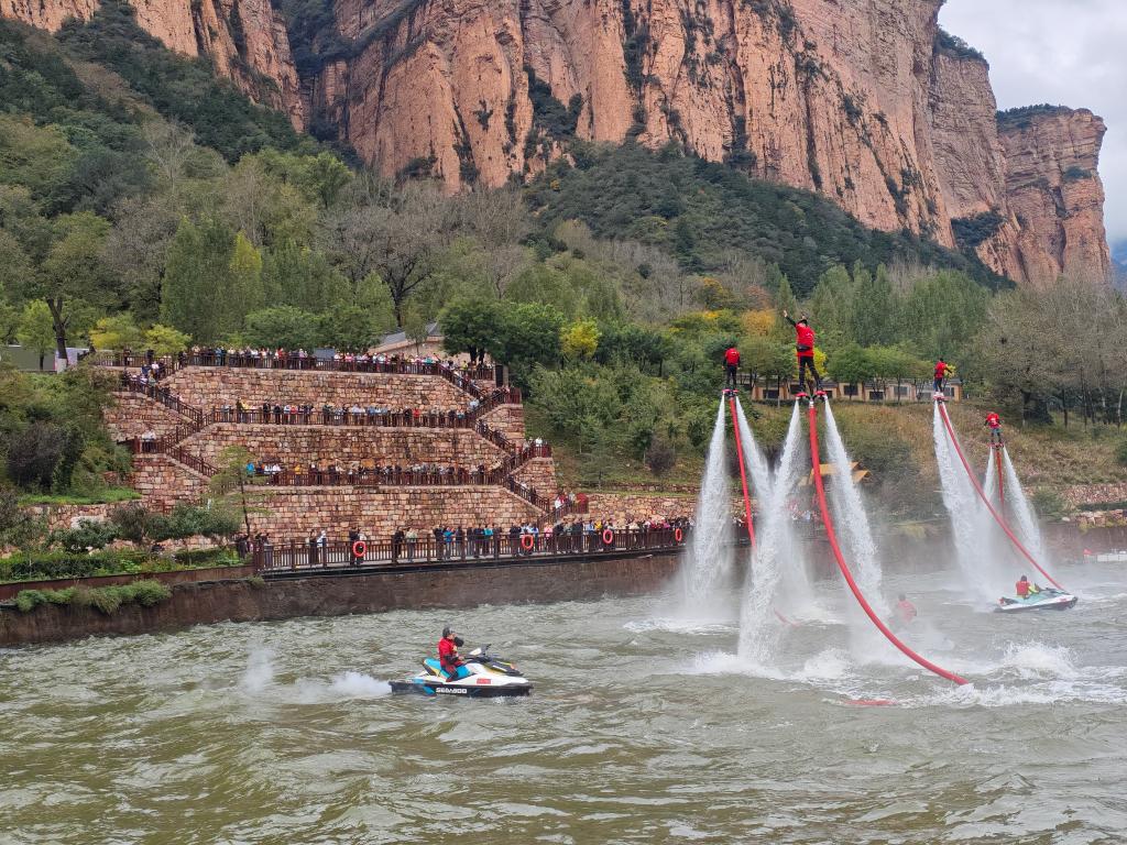 国庆当天,黄崖洞文化旅游区军工湖畔游客聚集,水上飞人表演者借助装置腾空,双人“空中双翼”造型掠过红色雕塑时,现场掌声不断。来自全国的游客在景区工作人员组织下,齐唱《我和我的祖国》,共同向祖国献上生日祝福。据统计,假期首日景区接待游客超过一万人次。
