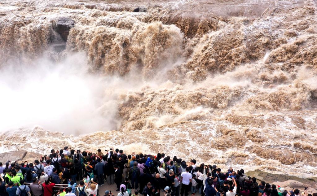 据当地水文部门介绍,受近期上游降雨等因素影响,当前壶口瀑布水量较大,每秒流量超过800立方米,约为平时的2倍。随着水量增加,黄河壶口瀑布也迎来了秋季最佳观赏期,山与水、绿与黄交织成一幅绚烂的秋日画卷,吸引众多游客近距离感受“千里黄河一壶收”的壮观景色。