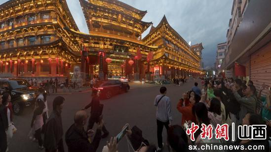 山西饭店作为百年老字号,凭借其雕梁画栋的古建风貌和夜间璀璨的灯光装饰,在国庆期间成为社交平台上的热门打卡地。华灯初上时,饭店周围“水泄不通”,游客纷纷拍照分享其气派典雅的门楼与融合传统美学的光影景观。