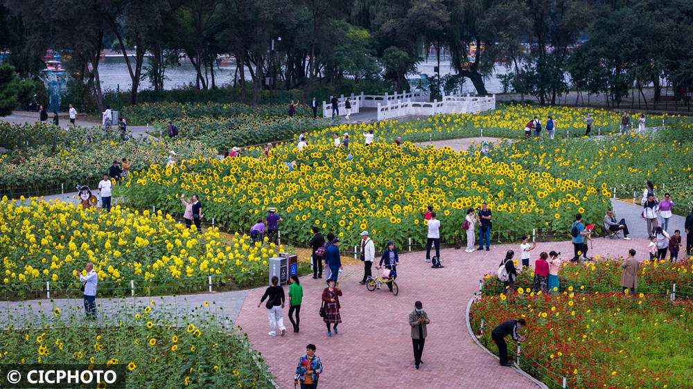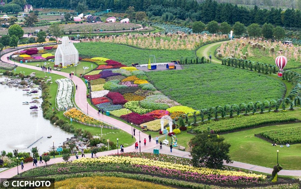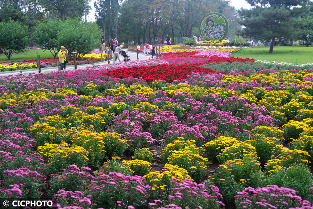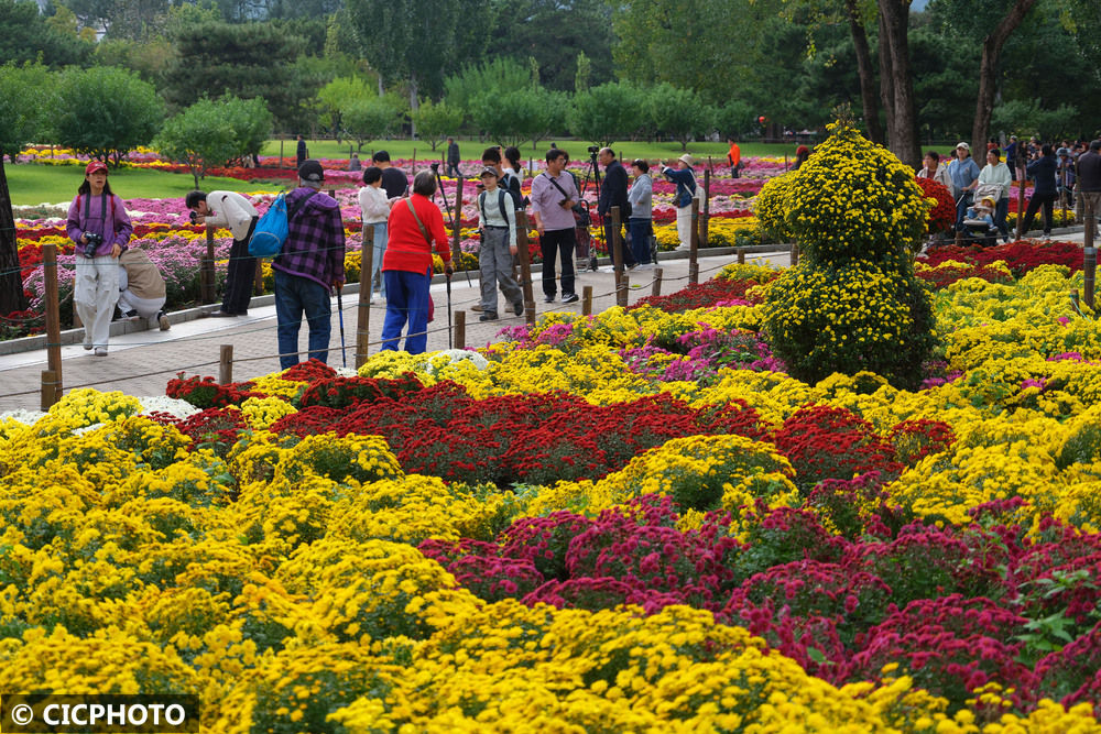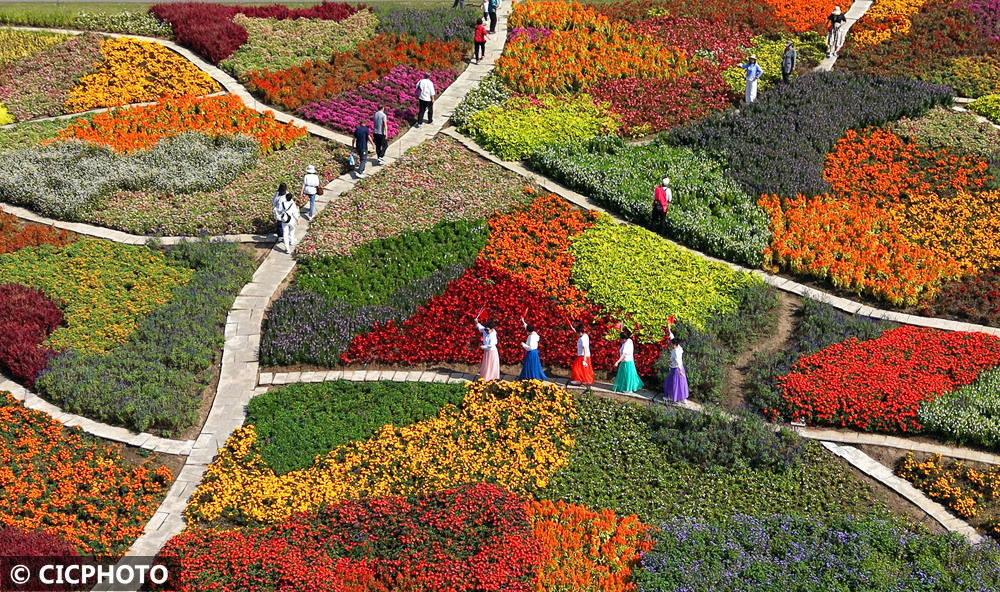 ↑2025年10月1日,人们在辽宁省沈阳市北陵公园赏花游玩。(无人机照片)CICPHOTO/国伏 摄