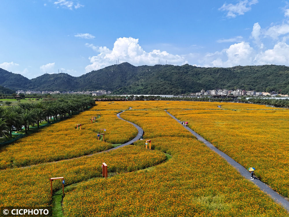 ↑2025年10月18日,人们在浙江省乐清市清江镇北塘村赏花游玩。(无人机照片)CICPHOTO/蔡宽元 摄