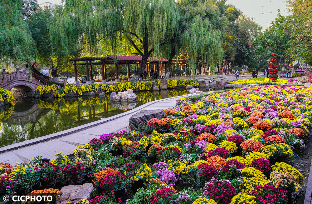 ↑2025年10月26日,人们在山西省临汾市襄汾县北汾河景观带赏花游玩。CICPHOTO/李现俊 摄