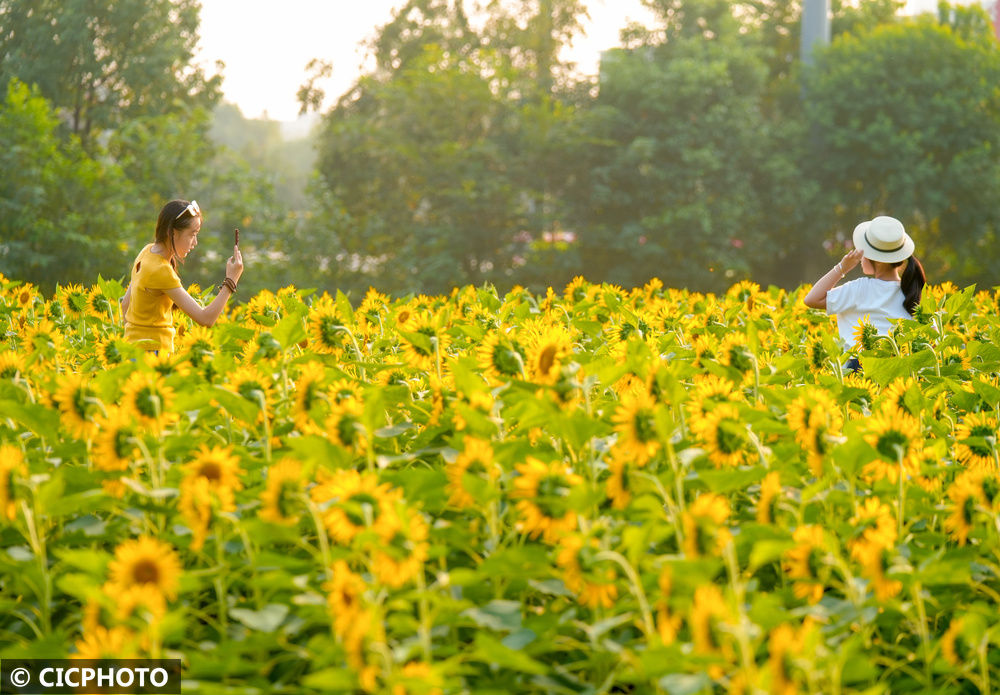 ↑2025年10月12日,人们在浙江省湖州市长兴县太湖街道三河湾公园的向日葵花海中赏花拍照。CICPHOTO/陈海伟 摄