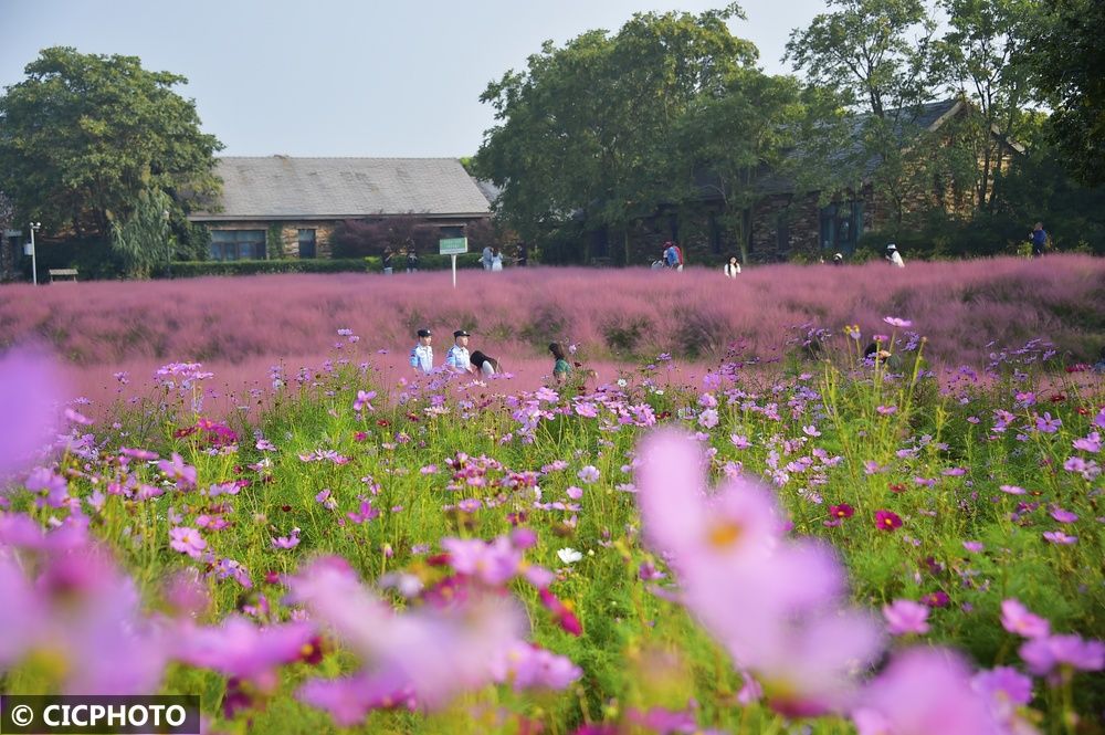 ↑2025年10月10日,人们在江苏省宿迁市三台山国家森林公园赏花游玩。CICPHOTO/孙明建 摄