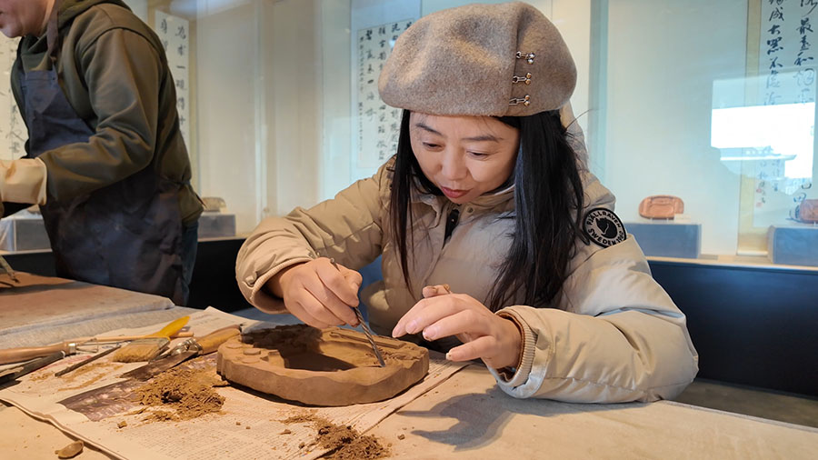 在山西绛州澄泥砚研制有限公司,展出各种形制和颜色的砚台,雕刻有的古朴、有的繁复,各具特色。其中为山西省各个县制作的砚台格外引人注目。“每个县的砚台都带有自身的特色,我们结合当地的文人典故、自然风光、历史文化、神话传说进行雕刻,比如应县,就雕刻着应县木塔,既具有辨识度,也使绛州澄泥砚成为传承历史文化的载体。”