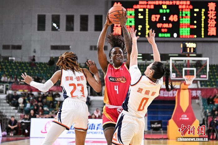 1月9日,新疆队32号球员莫普雷米尔(白衣)在比赛中投篮。当日,在太原举行的2025-2026赛季中国女子篮球联赛(WCBA)常规赛第14轮比赛中,山西竹叶青酒队主场以96比73战胜新疆天山队。中新社记者 韦亮 摄