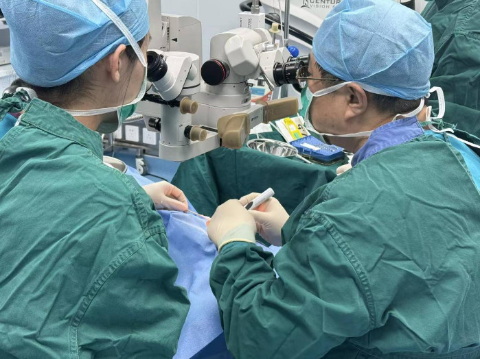 山西爱尔眼科医院副院长杨纪忠(右)为锁梅做手术。