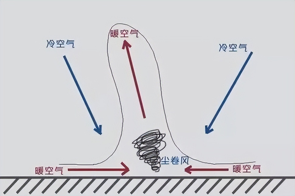 尘卷风是地面受局部强烈增温,在近地面气层中产生的一种尺度很小的旋风。地面受热不均匀使有些特定地点地温会高于周边,加热地表附近空气,引发局地暖空气上升,暖空气在上升过程中旋转,可以把尘土和一些细小物体卷扬到空中,形成一个小尘柱。