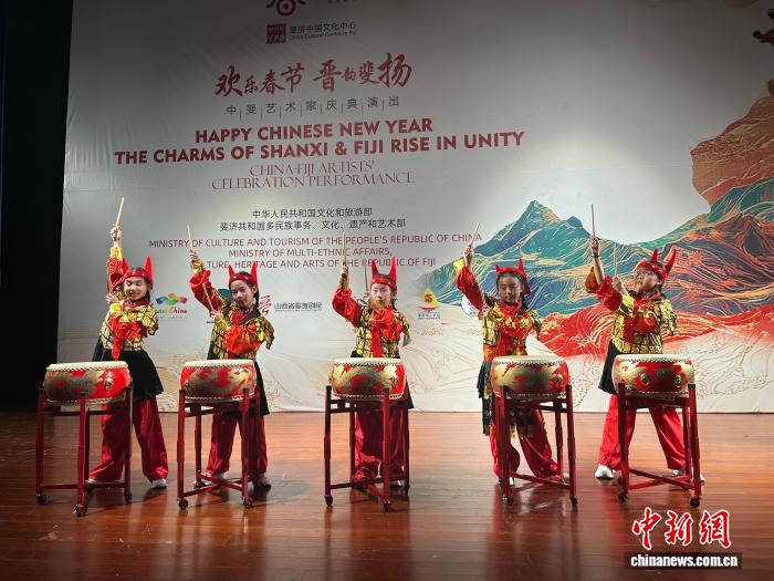 中新网太原2月12日电 (范丽芳 卫世新 杨建义)中国农历春节临近,斐济“欢乐春节”活动现场,迎来一场特殊的非遗展演。来自山西省新绛县西街实验小学的5名少年鼓手与绛州鼓乐市级非遗代表性项目传承人张新,以《秦王点兵》《滚核桃》两首经典曲目,将黄土高原的千年鼓韵首次敲进这个南太平洋岛国。