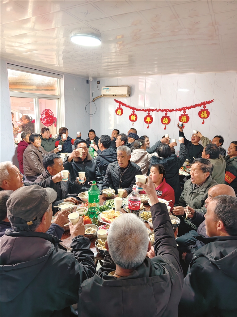 黄崖沟的乡亲们和海松围坐在一起过小年、吃团圆饭。